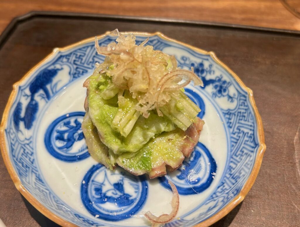 明石タコとセロリの葱山椒ソースあえには茗荷が添えられる。