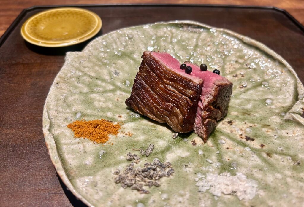 メインの肉は鹿児島産黒毛和牛ヘレ肉80g。時間をかけてゆっくりと火入れをする。薬味はカンボジアの生胡椒とオーストラリア産の塩、西天満の長池昆布。カリフォルニアの赤ワインと一緒に合わせる。