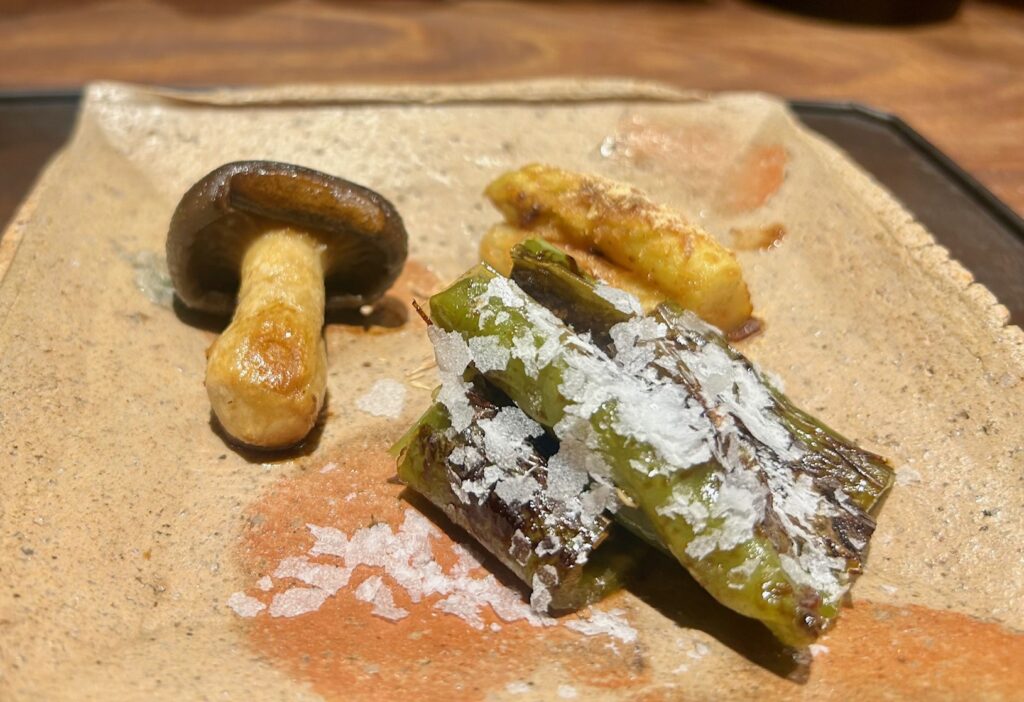 焼き野菜は丹波大黒ほんしめじ、甘長唐辛子の焦がし醤油焼き、ホワイトアスパラガスの自家製干し貝柱パウダー和えの3種を鉄板で焼いていただく。