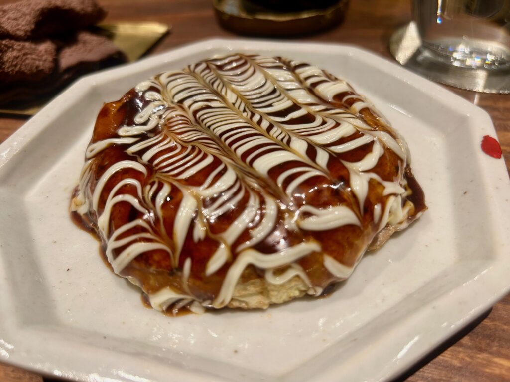 以前の店からの人気商品の「メレンゲのお好み焼き2000円」ふわふわですり下ろした山芋の味と細かくカットした豚肉がいい味わい。これ以外にもワインに合う前菜が色々あります。価格もとても良心的でした