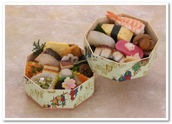 非常受欢迎的寿司便当。选用的食材主要有:虾、鲷鱼、鸡蛋卷、扇贝、腌制的红姜(根据食材的采购情况,也会有内容变更的情况发生)。寿司和搭配的小菜都被放在特制的二层便当盒里。