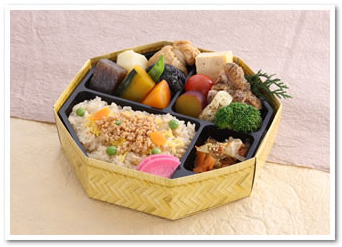 为小朋友们准备的便当,特别考虑了对小朋友成长不可欠缺的营养平衡。主要含有:豆制品、小鱼、新鲜蔬菜,由蛋黄沙司调制的烤蟹腿、扇贝,和本店特制的煎鸡蛋,糙米饭团等。