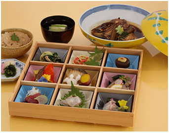 选用料理长特别推荐的新鲜生鱼片和蔬菜等食材,精心制作成的具有九个拼盘的鲷鱼料理。