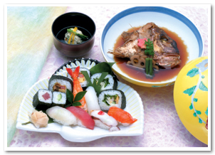 精选的时令新鲜海鱼制作成日式饭团和寿司卷,加上红烧鲷鱼,是一份物超所值的午餐。另外,料理的内容会根据时令经常变化。